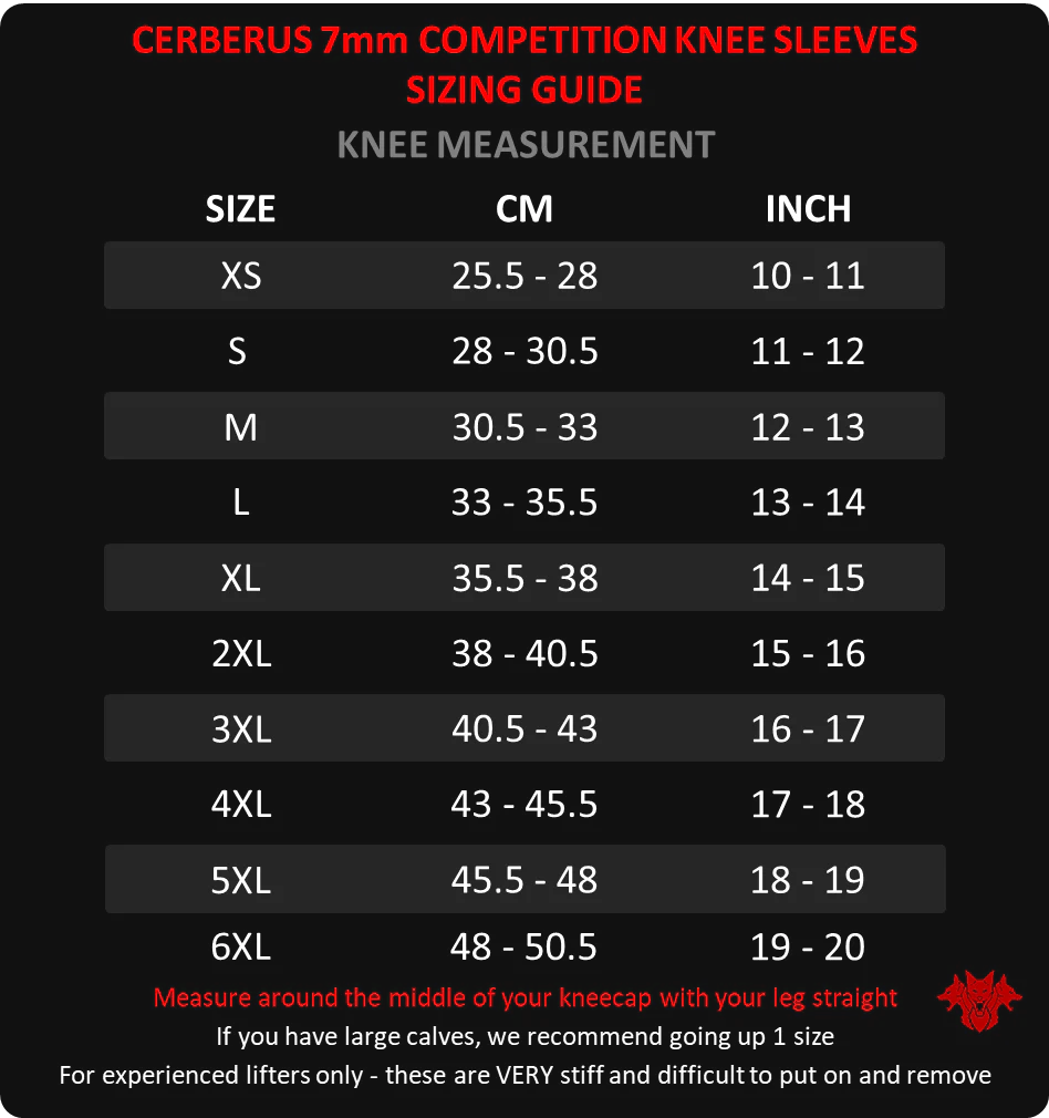 CERBERUS Competition Knee Sleeves are made from our exclusive new blend of neoprene. They are EXTREMELY stiff to give you maximum compression and the most “pop” you can get from a 7mm neoprene knee sleeve!