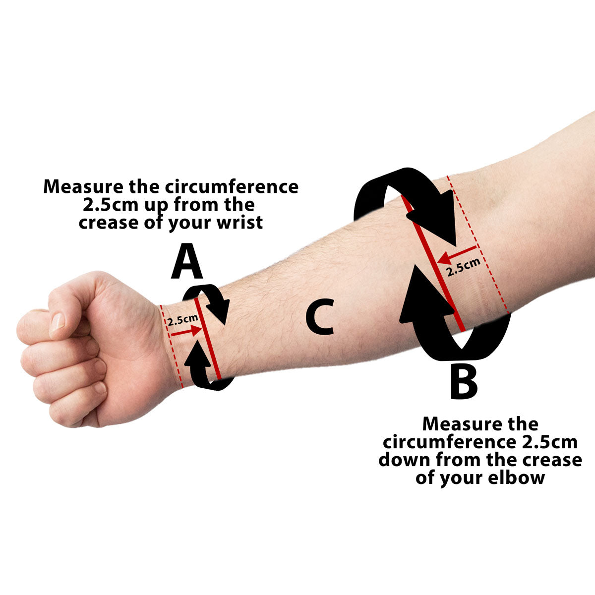 - B - Forearm circumference – measure 2.5cm down from the creases of your elbow, now measure around that point on your forearm. Make sure the tape is pulled firm.